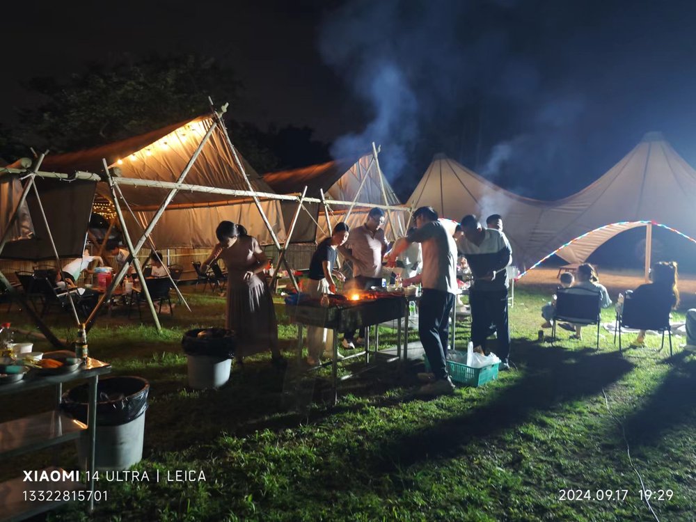 超好玩的帽峰山露营团建:天幕烧烤+户外电影/唱歌+篝火晚会发表时间:2024-09-19 09:00 露营,不仅仅是一种放松的方式,更是一种与自然亲密接触的生活态度。在离城市不远的一处露营基地,有着开阔的草地,有清澈的小溪流过,一顶顶帐篷在阳光下显得格外温馨。 结束了下午的活动,重头戏来了----天幕下的烧烤!新鲜的食材在炭火上慢慢烤制,撒上特制的香料,肉质鲜嫩多汁,每一口都是满足。大家围坐在一起,分享着美食,谈笑风声,气氛十分融洽。